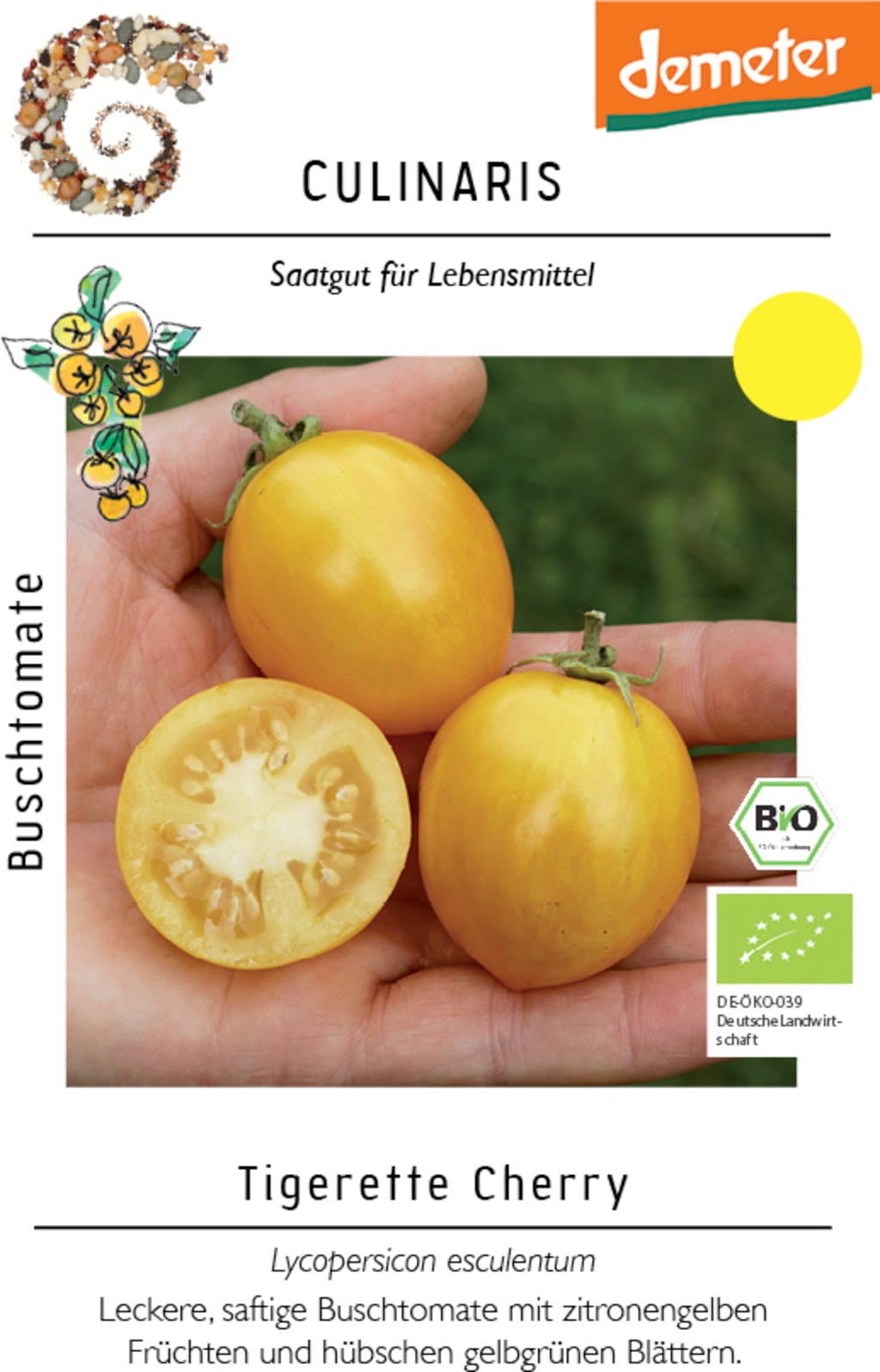 Tigerette Cherry è un pomodorino succoso, di colore giallo limone e dal sapore delicato. Cresce in modo compatto ed è perfetto per vasi, balconi o aiuole. Le decorative foglie giallo-verdi mettono in risalto i frutti in modo splendido. Da inizio luglio offre un raccolto aromatico e costante.