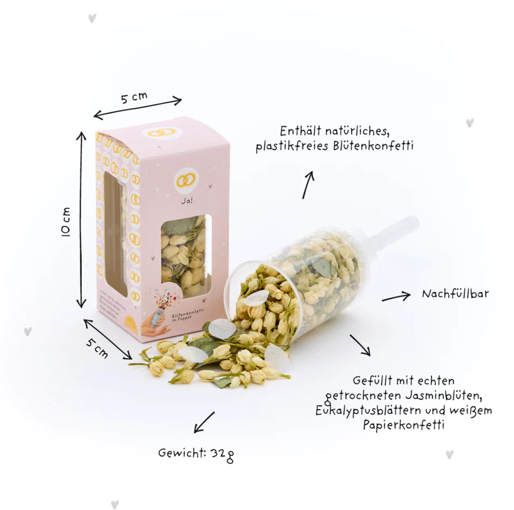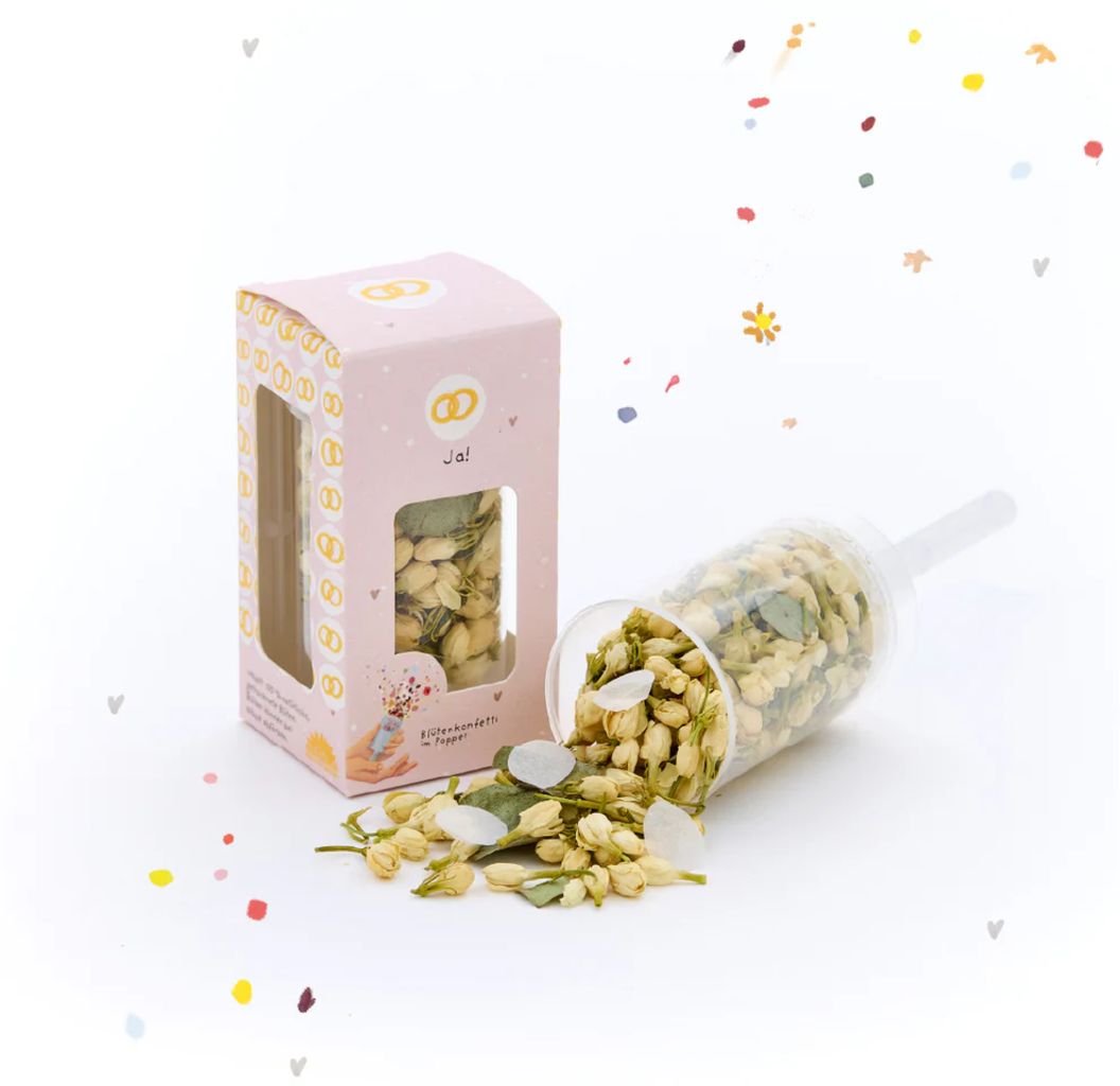 Festeggia l’amore con coriandoli di fiori sostenibili. Che tu sia un invitato o parte della coppia di sposi, questo sparacoriandoli con la scritta “Ja!” (in tedesco "Si!") porta gioia, colore e un tocco di natura in uno dei momenti più belli della vita. Ideale per matrimoni, cerimonie religiose o celebrazioni all’aperto.