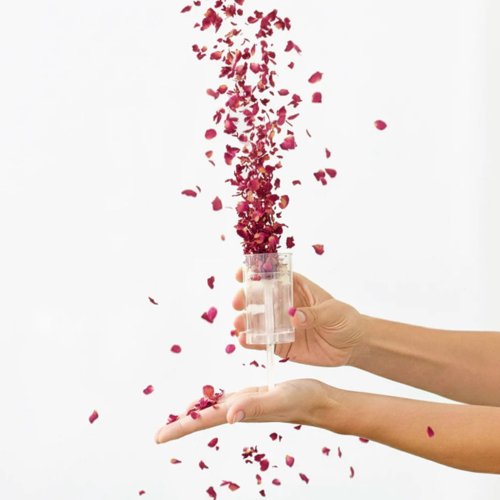Modo d’uso: inserisci il bastoncino nel foro alla base e colpiscilo con decisione verso l’alto. I coriandoli floreali verranno proiettati in aria in un istante.