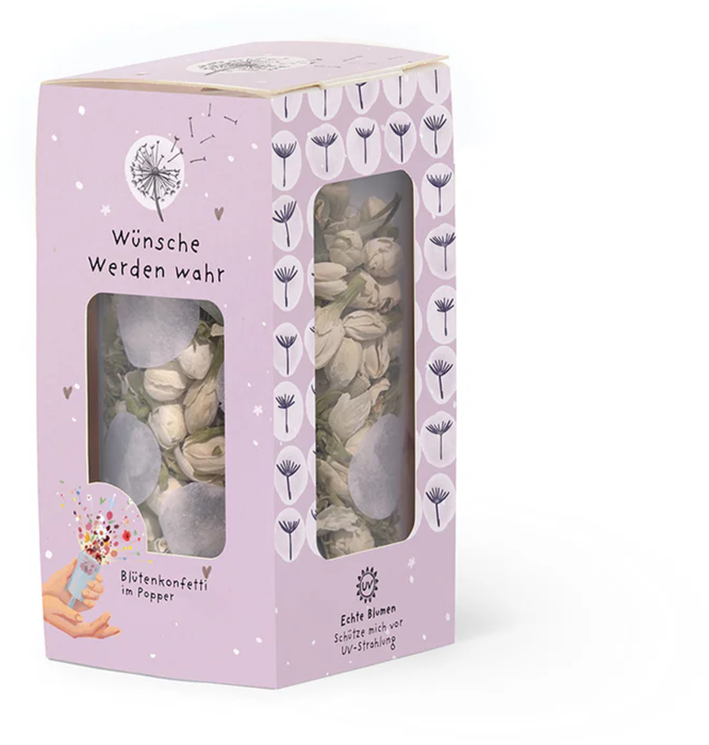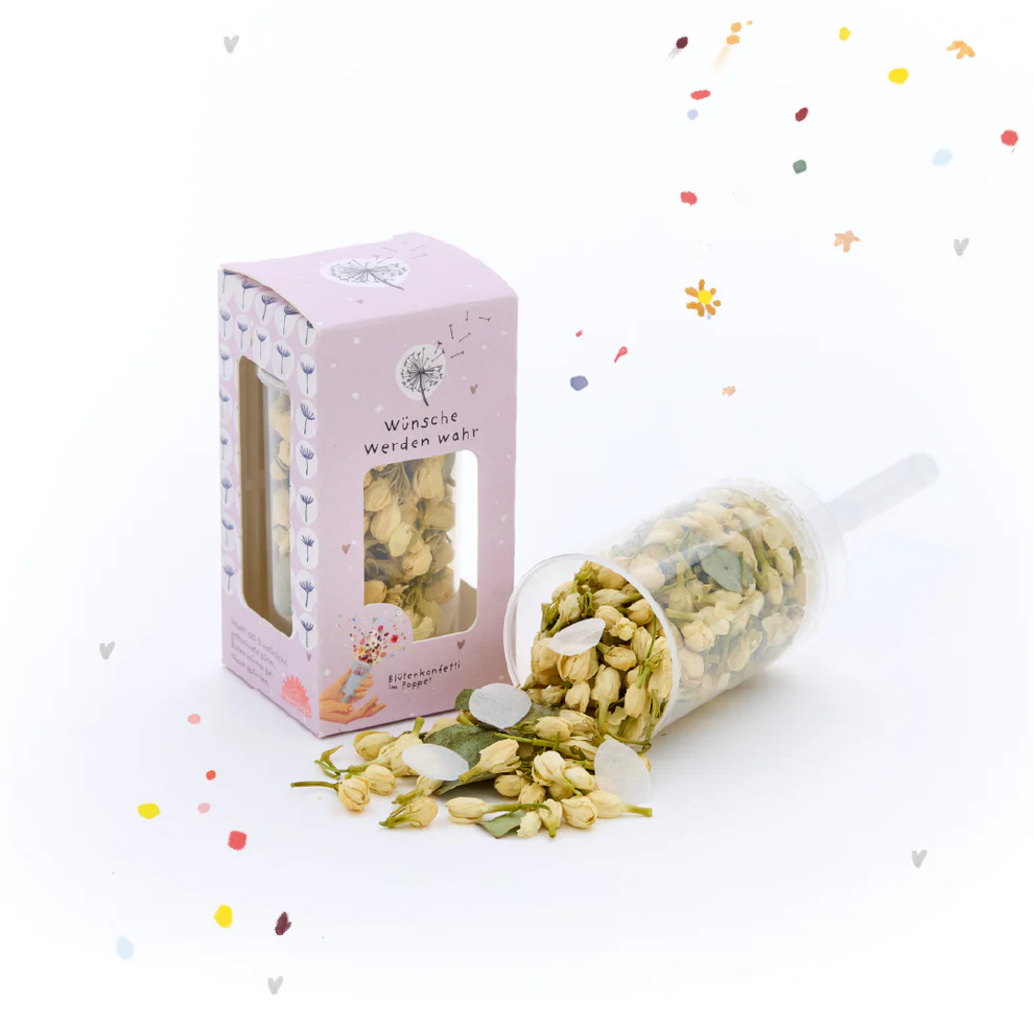 I desideri diventano realtà… a volte bastano solo un po’ di coriandoli. Questo sparacoriandoli di fiori diffonde nell’aria gioia, magia e buoni auspici. Perfetto per donare a qualcuno coraggio, speranza o semplicemente un tocco di incanto.