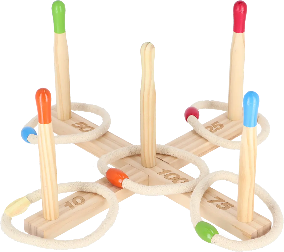 - Set con croce in legno, 5 anelli in corda e sacchetto a rete per riporlo