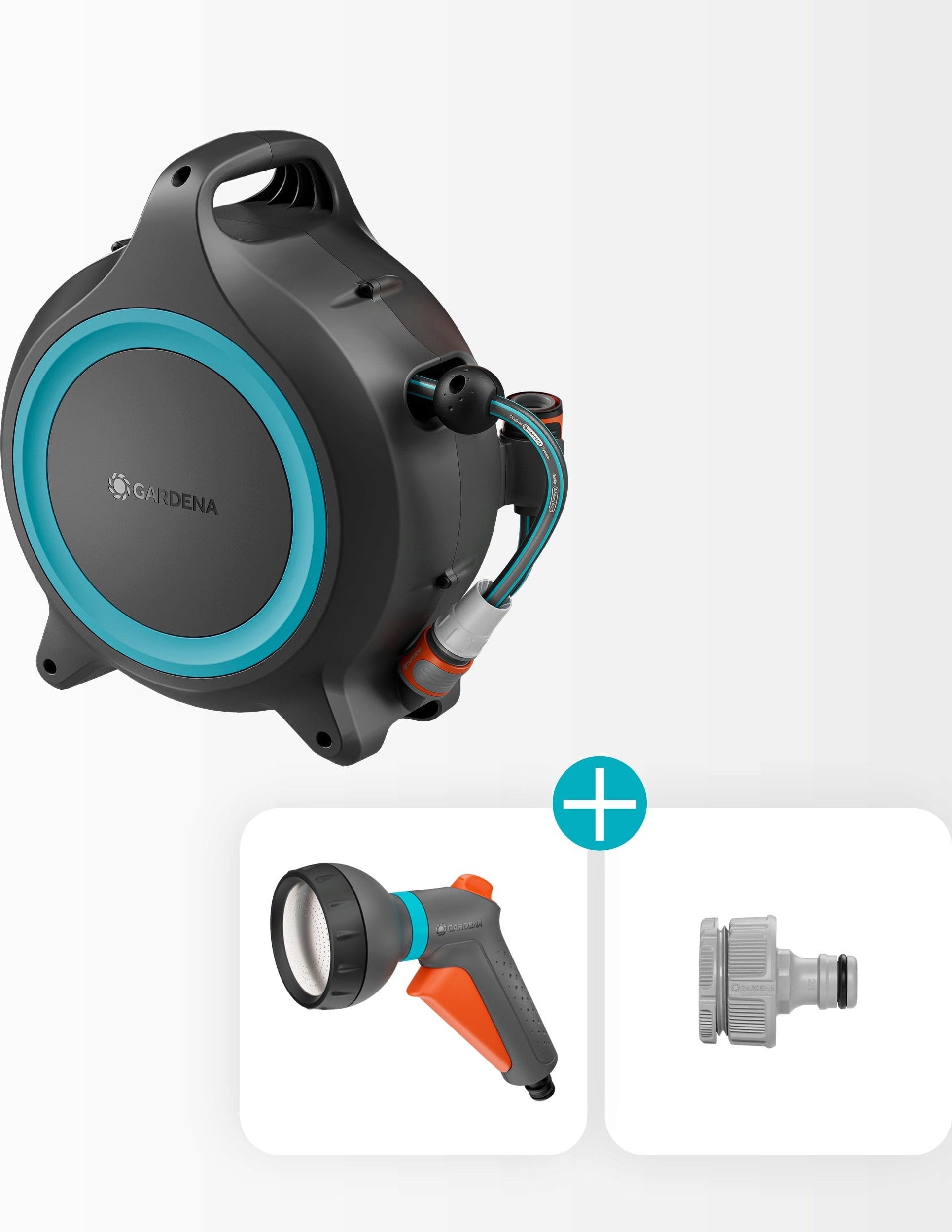 Contenuto della confezione: 1 x avvolgitubo portatile Move con tubo da 12 m (8,5 mm), 1 x lancia Classic, 1 x raccordo per rubinetto con adattatore, 1 x supporto per accessori