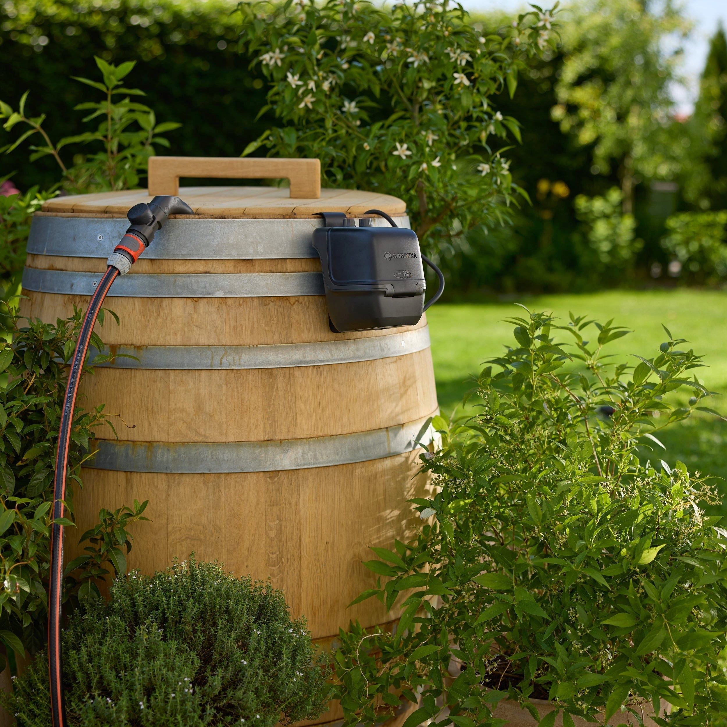 Trasforma il tuo serbatoio per l'acqua piovana in una stazione di irrigazione intelligente. Il set ComfortAutomatic offre il massimo comfort d'uso: grazie alla funzione di accensione e spegnimento automatici, la pompa si avvia subito quando apri la lancia da giardino e si arresta non appena la richiudi. In questo modo si risparmia preziosa energia della batteria e si ottiene una praticità simile a quella di un classico collegamento idrico.