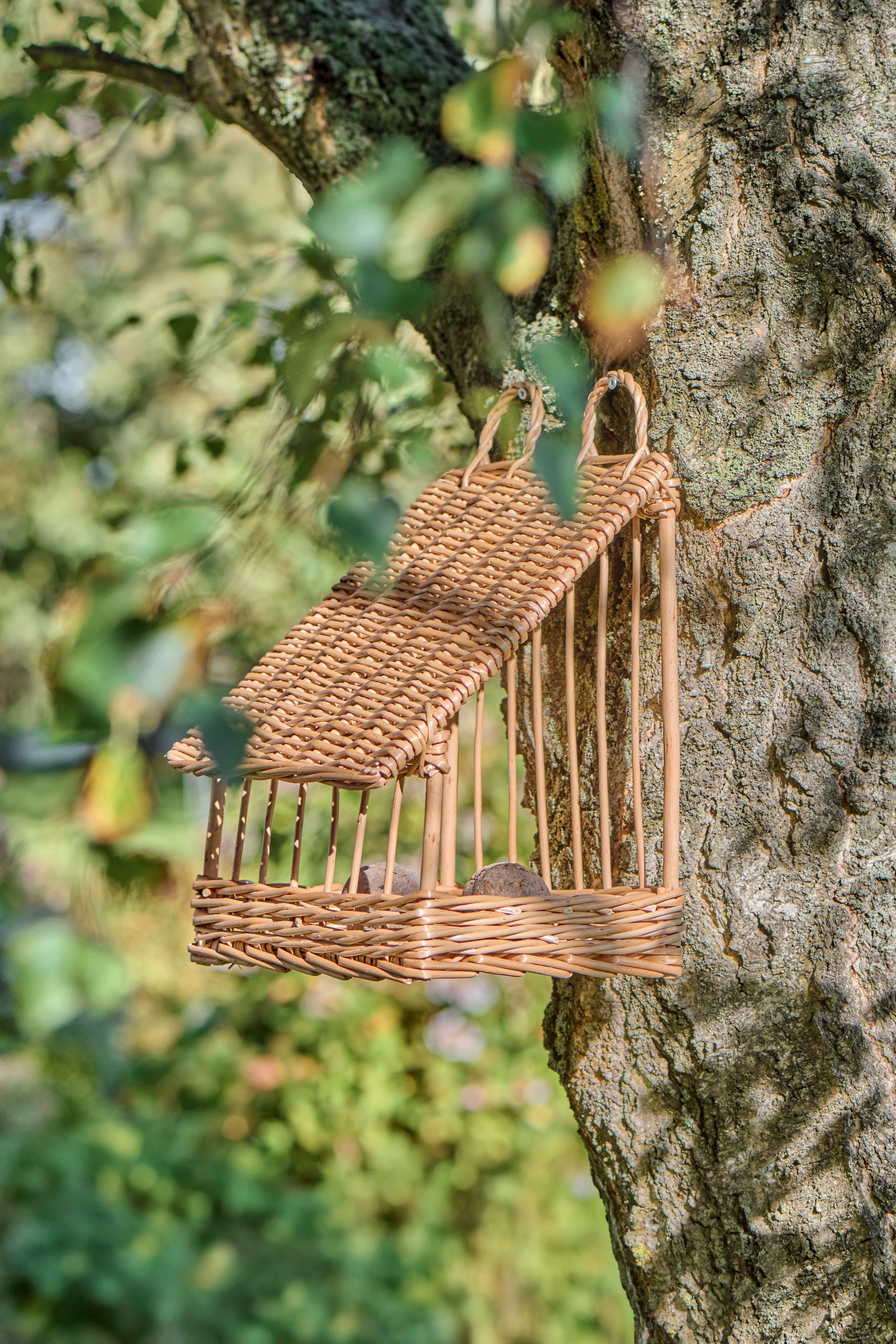 Mangiatoia da parete per uccelli in vimini naturale, ideale per creare un punto di alimentazione protetto e portare più vita nel giardino con un dettaglio decorativo dal carattere naturale.