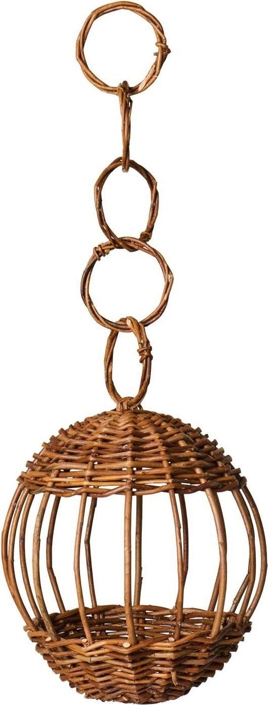 Mangiatoia sospesa per uccelli in vimini naturale non scortecciato, ideale per offrire un posto sicuro dove nutrirsi e allo stesso tempo arricchire il giardino con un tocco decorativo naturale.