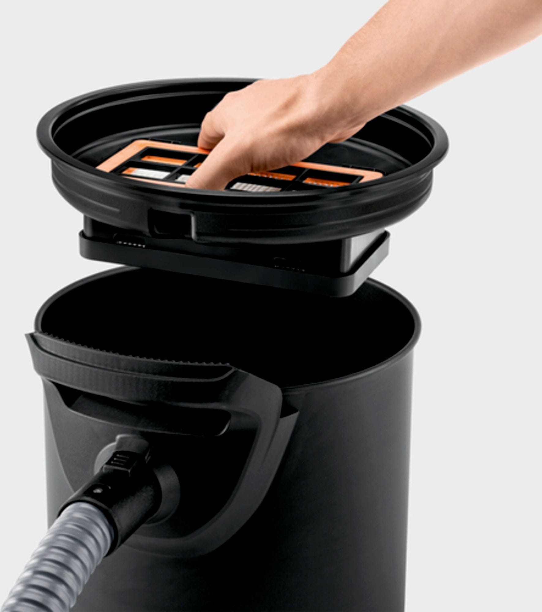 Un sistema integrato di pulizia del filtro consente di pulire il filtro con la semplice pressione di un pulsante, ripristinando rapidamente la piena potenza di aspirazione. Il robusto sistema filtrante composto da filtro plissettato piatto e prefiltro metallico per sporco grossolano garantisce una raccolta sicura dei residui di cenere. Grazie ai materiali ignifughi, l'aspiratore è progettato appositamente per l'uso con cenere di stufe e barbecue.