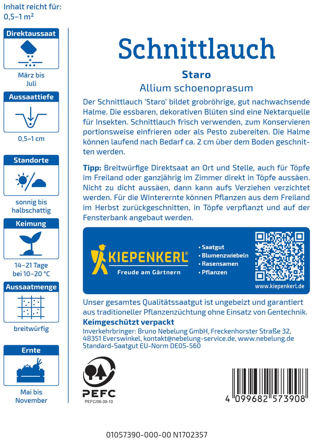 L'erba cipollina della varietà "Staro" produce steli vigorosi e aromatici con fiori decorativi, apprezzati sia in cucina sia dagli insetti. È perfetta per aiuole, orti rialzati o vasi ed è ideale per il taglio fresco, il congelamento o la preparazione di pesto. Un'erba aromatica indispensabile per giardini e davanzali.