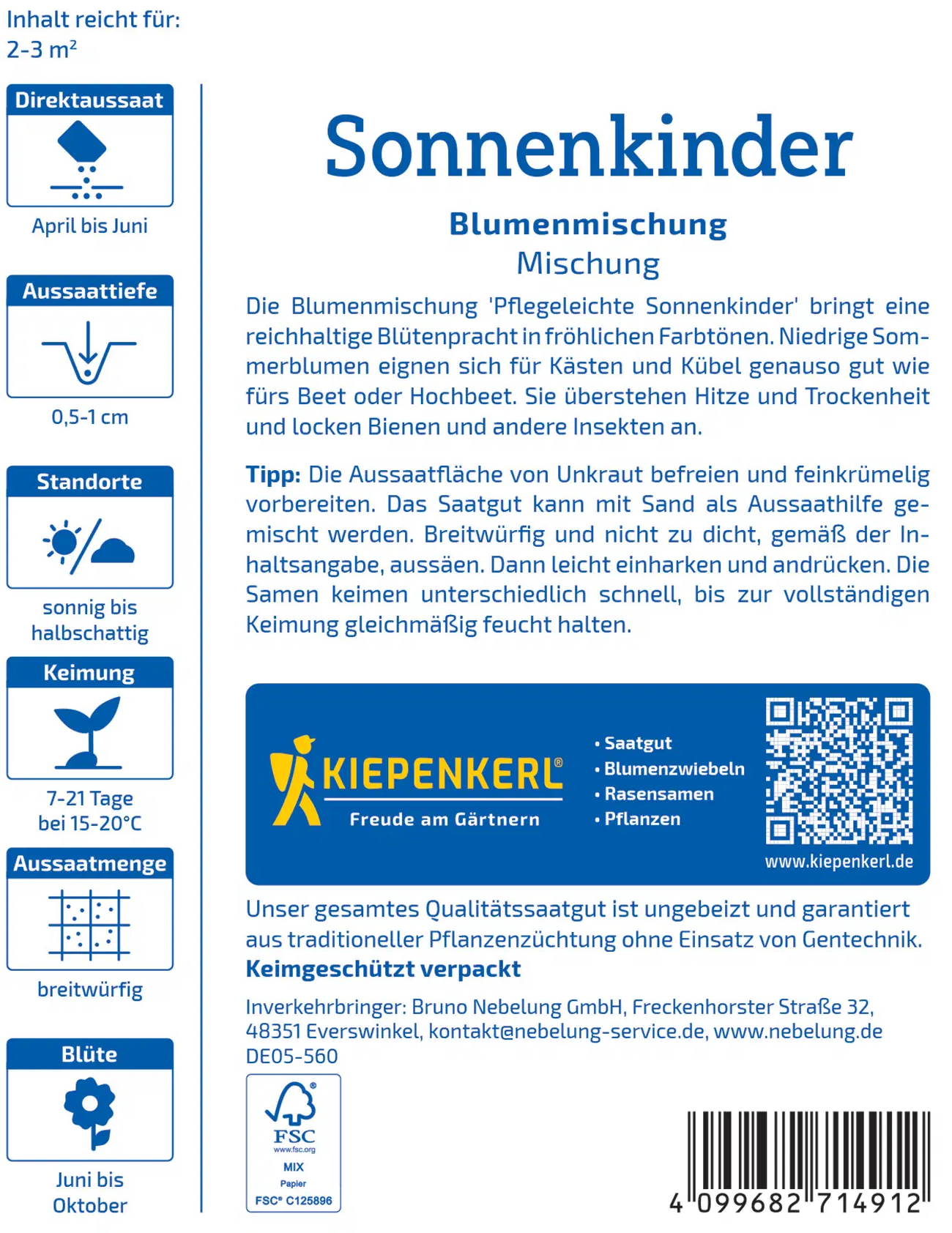 Il mix di fiori "Figli del sole di facile cura" porta colore e vitalità in giardino, sul balcone o nell'orto rialzato con il minimo impegno. Richiede poche cure, è particolarmente robusto e attira insetti utili. Perfetto per chi desidera un giardino estivo colorato e facile da gestire.