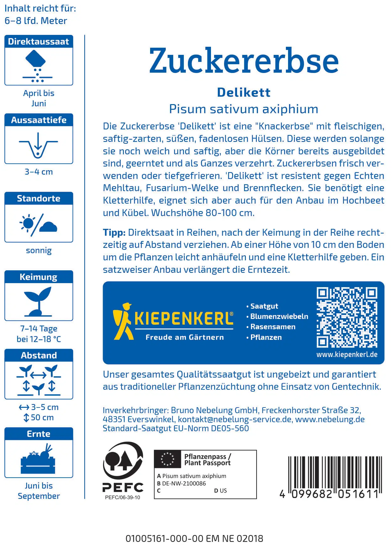 Il pisello mangiatutto della varietà "Delikett" conquista con baccelli teneri, succosi e dolci, da gustare freschi direttamente dalla pianta. Basta seminare, fornire un sostegno e osservare la crescita di piselli deliziosi e decorativi.