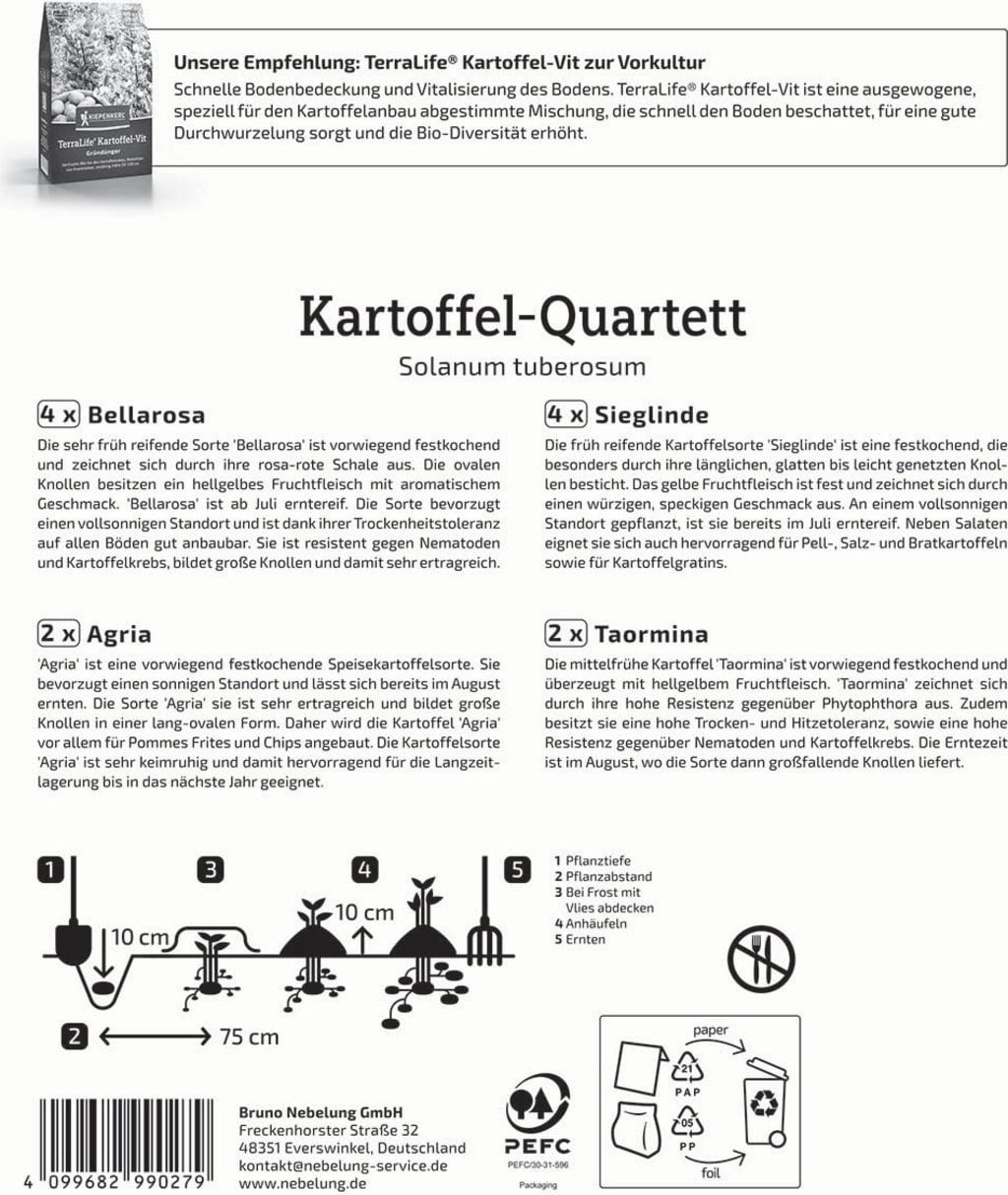 Questo meraviglioso mix è composto da quattro diverse varietà di patate, apprezzate per la loro pasta compatta, alcune delle quali maturano contemporaneamente e altre in tempi diversi. Questo ti permette di coprire il fabbisogno di patate con il tuo raccolto per un lungo periodo di tempo.