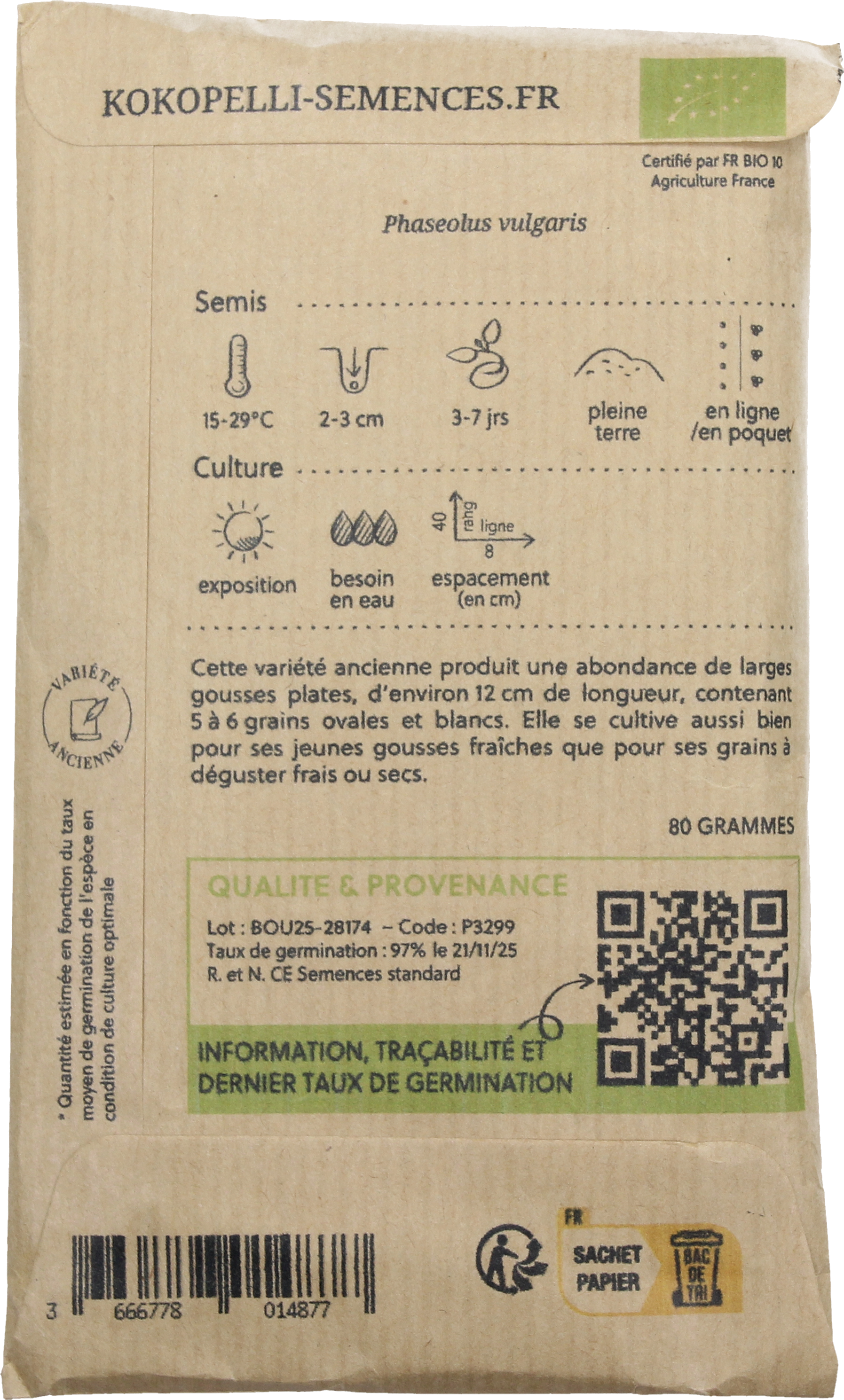 Questa antica varietà di fagiolo si distingue per i numerosi baccelli teneri e i semi bianchi ricchi di nutrienti. Perfetta per l'orto domestico: ottima appena raccolta come snack oppure essiccata per la conservazione.
