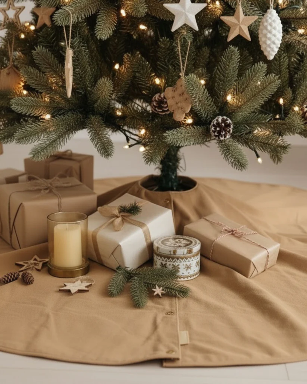 Questa raffinata gonna per albero di Natale dona a ogni albero un tocco elegante e armonioso. Il morbido tessuto in cotone protegge il pavimento da aghi e resina, creando al tempo stesso un’atmosfera calda e accogliente. Grazie al design reversibile, è possibile cambiare facilmente stile scegliendo tra delicate tonalità beige e marrone oppure beige e salvia.