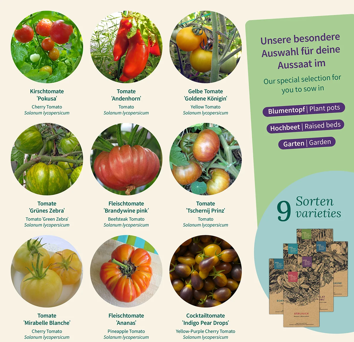Grandi, piccole, tonde, allungate, rosse, gialle o scure: i pomodori non si distinguono solo per il sapore, ma anche per l’aspetto. Questo set di semi riunisce nove varietà selezionate, adatte alla coltivazione in giardino e sul balcone. Un vero must per gli amanti di questo frutto straordinario.