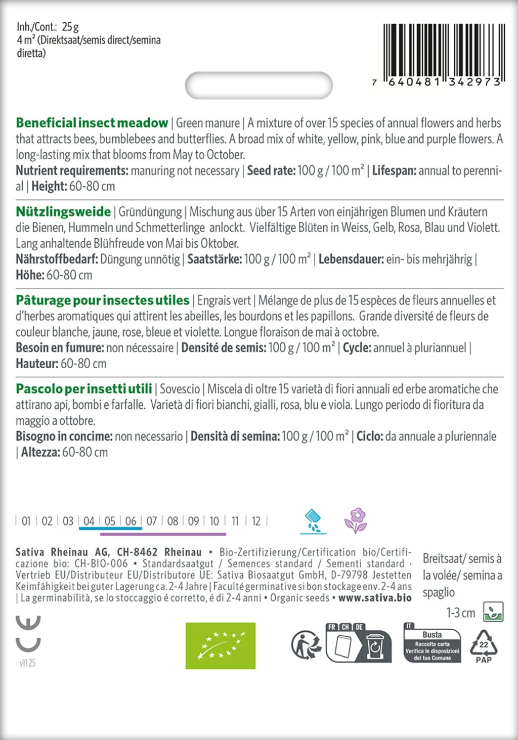 La miscela Pascolo per Insetti Utili è un sovescio variegato con fioriture colorate che attirano numerosi insetti utili e garantiscono una lunga durata della fioritura. Predilige terreni sciolti e ricchi di humus e contribuisce attivamente alla biodiversità del giardino.