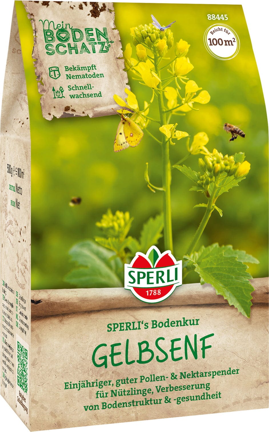 La senape gialla è una coltura da sovescio ideale, essendo una pianta annuale appartenente alla famiglia delle Brassicacee, che arricchisce il terreno di nutrienti, ne migliora l'aerazione ed è tollerante alla semina tardiva. Grazie alla sua densità, riduce la crescita delle erbe infestanti e protegge il suolo dall'erosione. Allo stesso tempo, gli oli essenziali contenuti nella senape gialla contrastano le infestazioni di nematodi e hanno un effetto positivo sulla flora batterica e fungina del terreno. Inoltre, la senape gialla è una buona fonte di polline e nettare.
