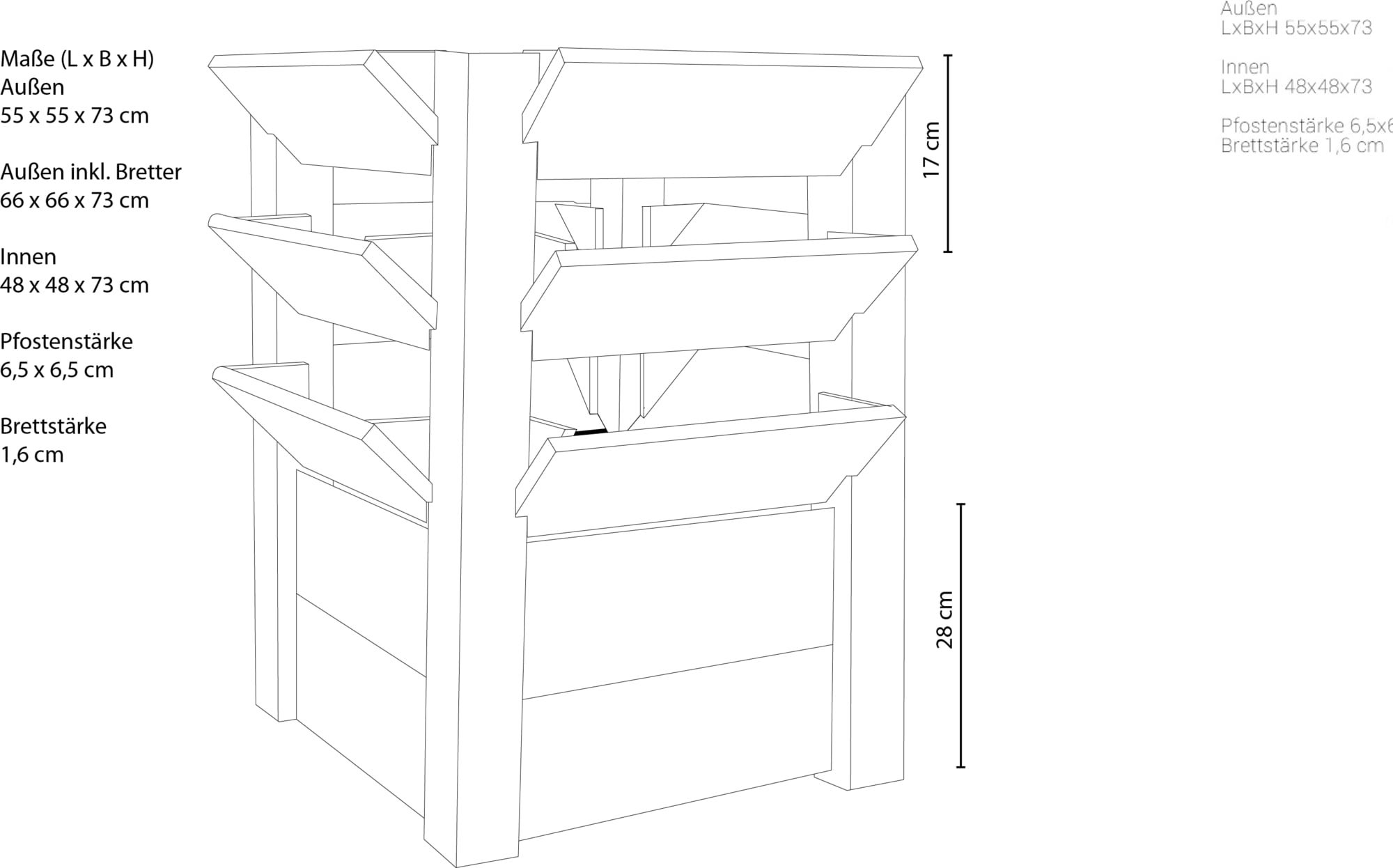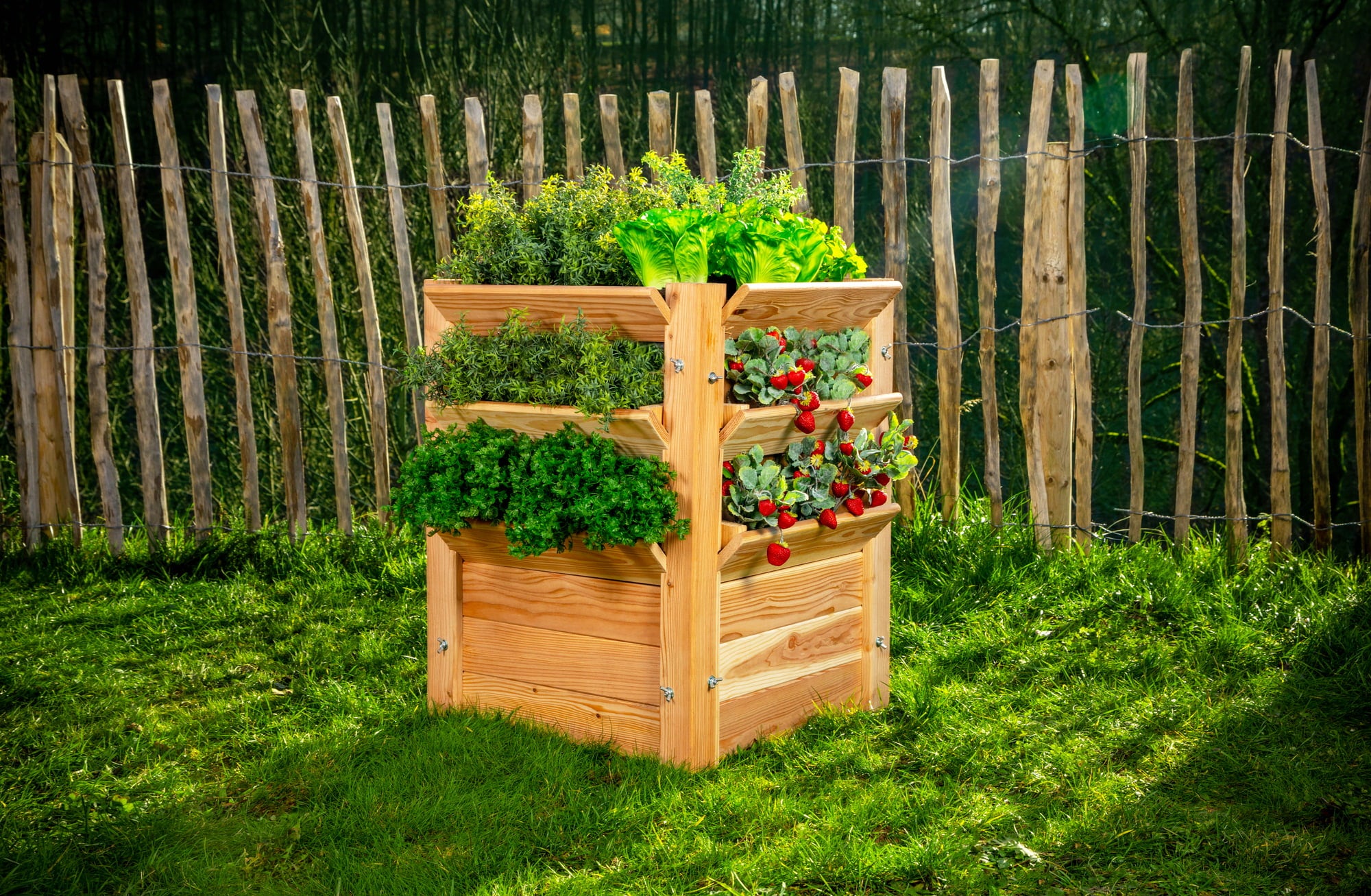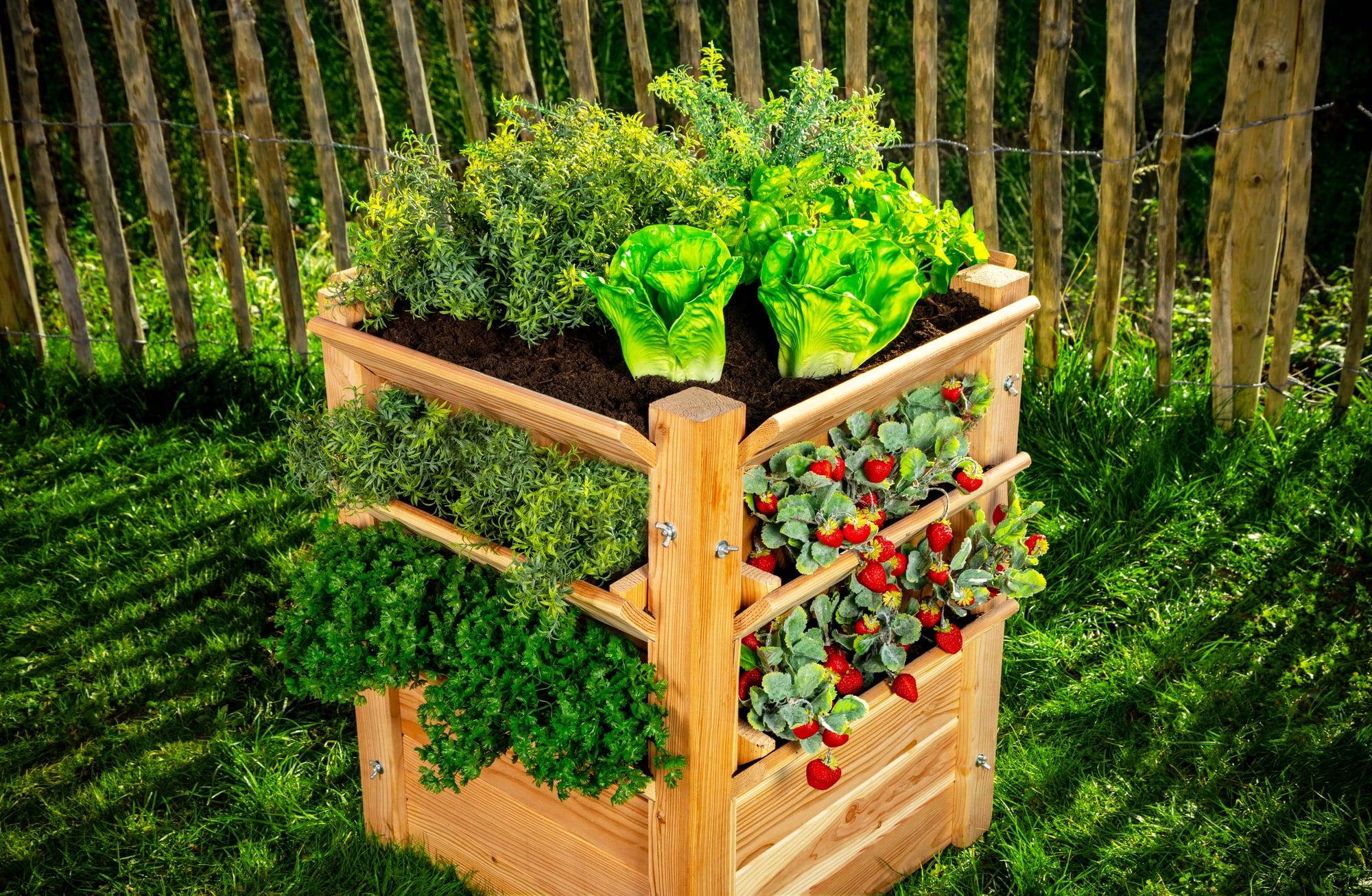 L'orto rialzato Premium offre un extra davvero speciale, poiché non solo fornisce la superficie generale per la piantagione, ma può anche essere utilizzato sui lati per piantare fragole, erbe aromatiche, ecc. In questo modo, lo spazio disponibile raddoppia, un grande vantaggio soprattutto per i giardini di piccole dimensioni. Il legno di larice utilizzato proviene da una gestione forestale sostenibile locale ed è estremamente resistente alle intemperie, integrandosi perfettamente nell'ambiente circostante. Una vera meraviglia di spazio che, oltre alla sua funzionalità, aggiunge anche un fascino estetico e un valore aggiunto per giardini, balconi e terrazze.